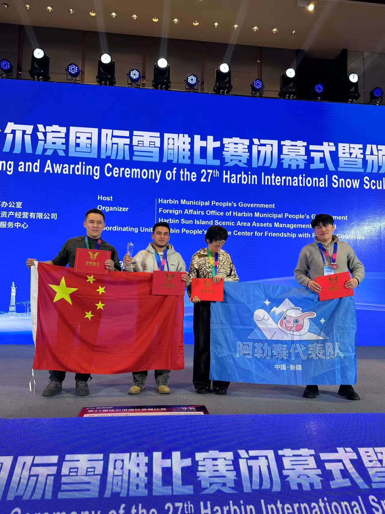 阿勒泰新闻网-阿勒泰地区融媒体中心 ( 记者 古丽娜 )1月10日,阿勒泰记者从地区工会获悉,在第27届哈尔滨国际雪雕比赛中,由阿勒泰地区工会选送的冰雪雕塑团队代表中国三队以作品《智网殊同》获得该项赛事二等奖。