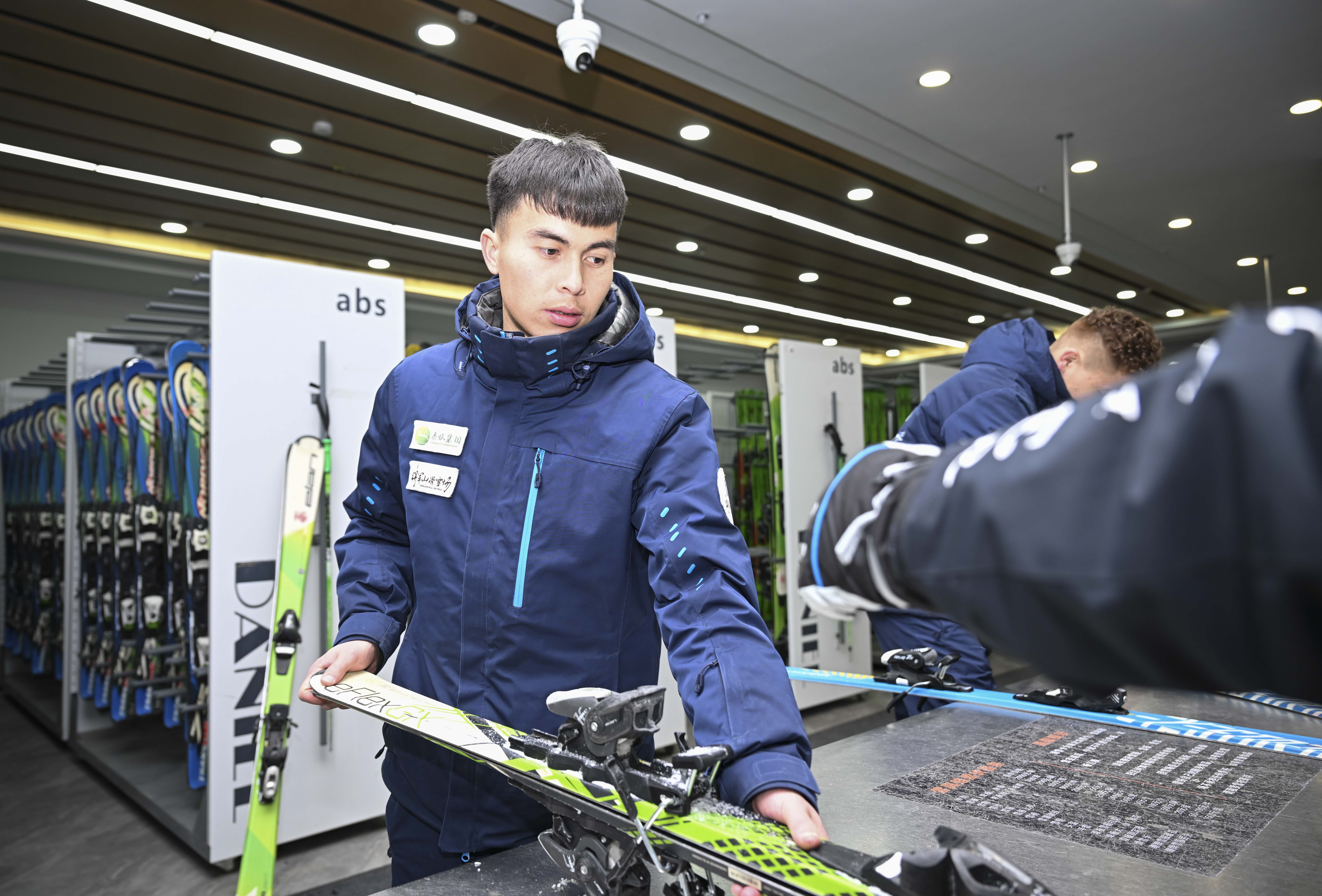 将军山国际滑雪度假区员工斯拉吉丁·热依木为“雪友”整理滑雪板(1月24日摄)。他毕业后在这里工作已有四年。 新华社记者 胡虎虎 摄