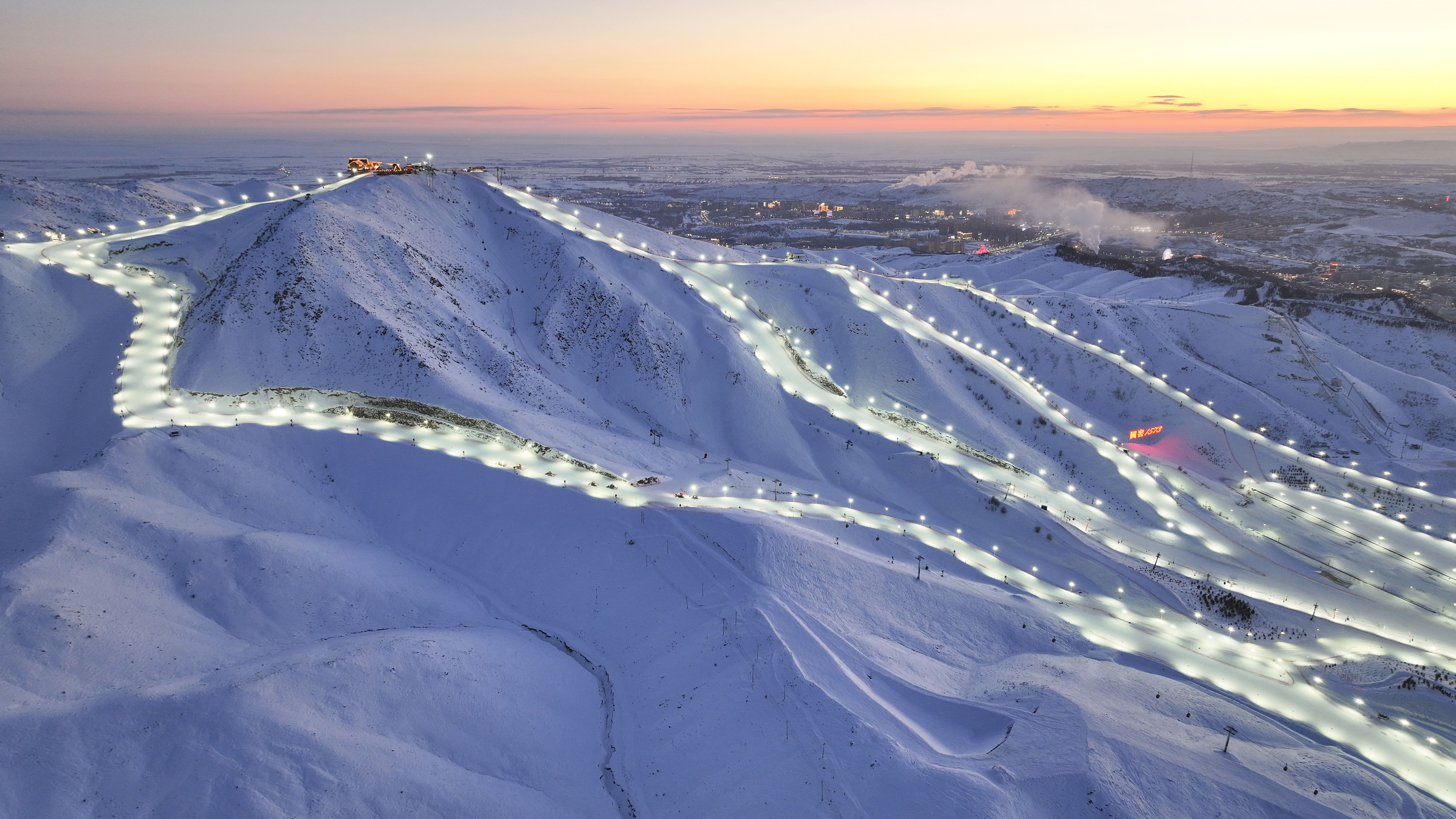 黄昏时分的将军山国际滑雪度假区(1月24日摄,无人机照片)。将军山国际滑雪度假区在夜间开放多条雪道,以满足“雪友”多样化需求。 新华社记者 胡虎虎 摄