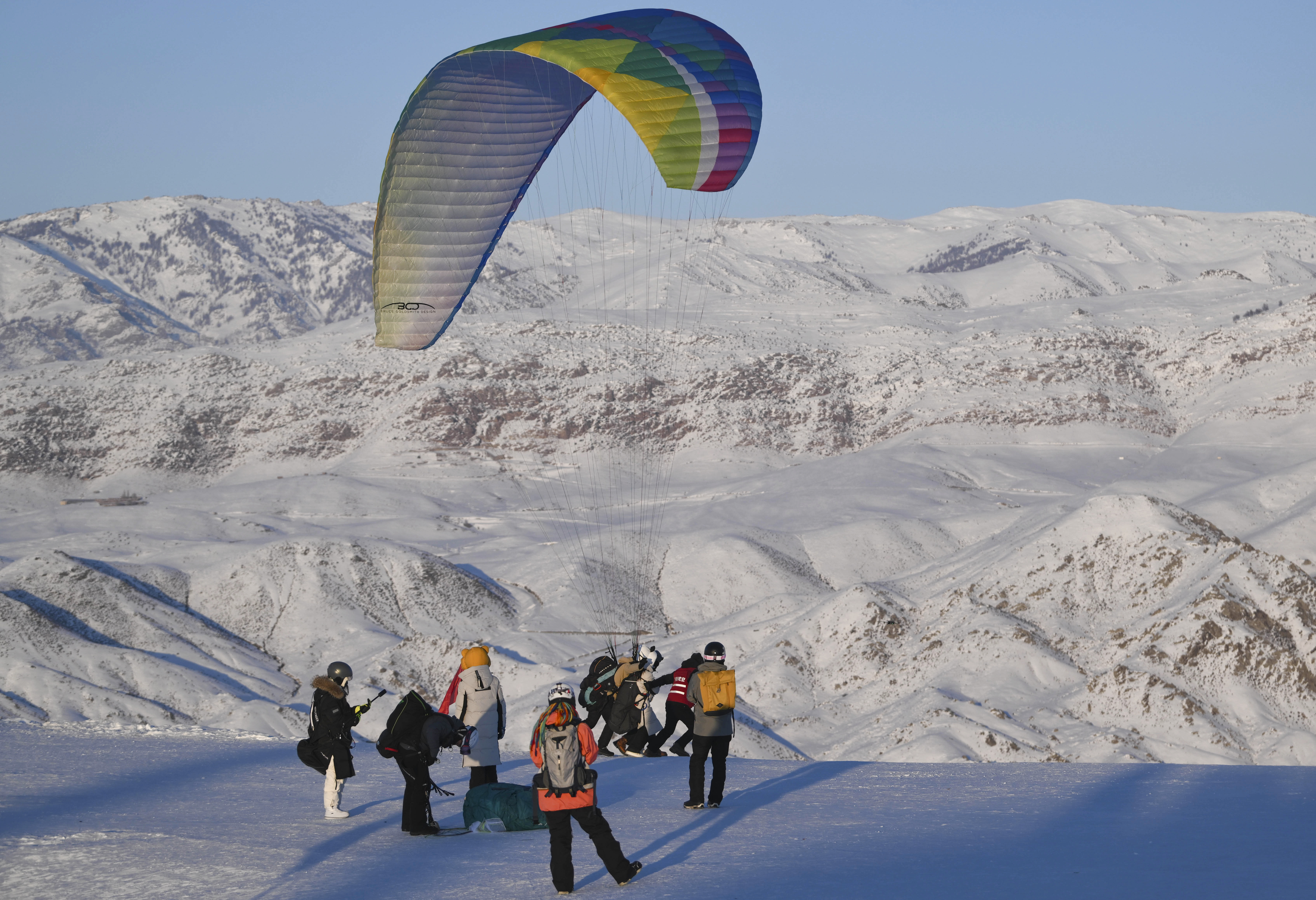 1月24日,游客在将军山国际滑雪度假区体验滑翔伞。 新华社记者 胡虎虎 摄