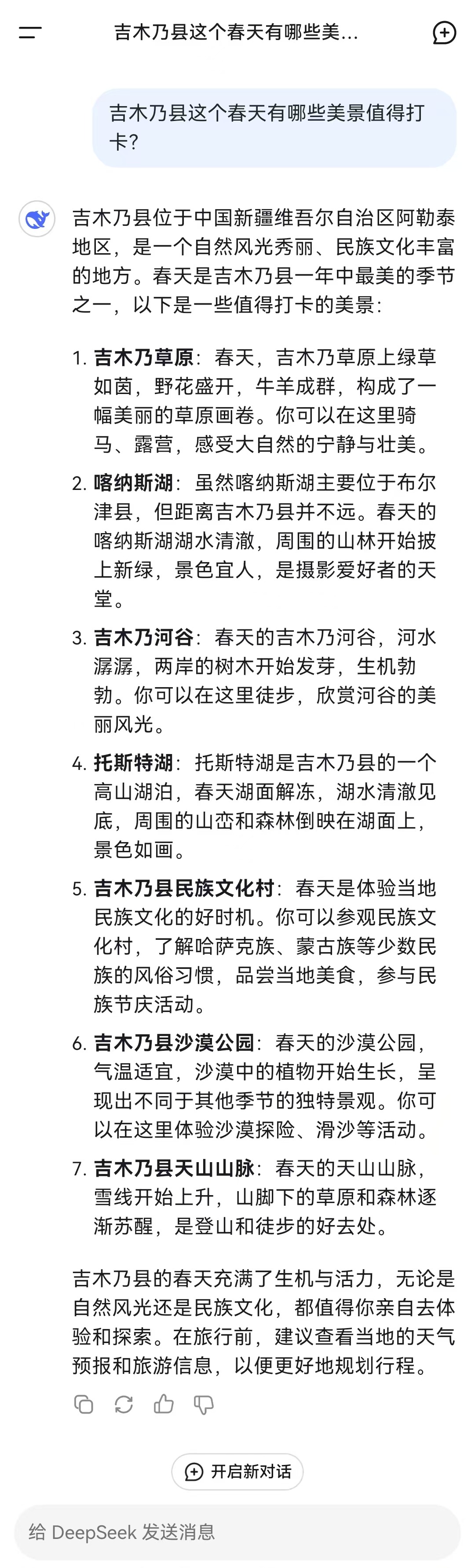deepseek从历史文化、自然风光等不同的维度给予了观光者不同的路线选择。涵盖了吉木乃草原石城、峡谷、通天洞遗址等不同的吉木乃标志性景点,有没有你动的路线或打卡点?趁着周末,走一趟吧~
