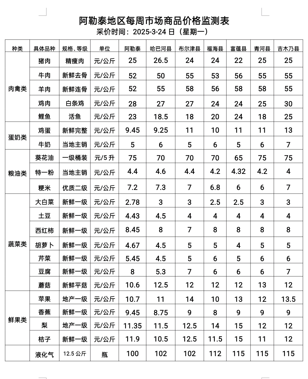 阿勒泰地区每周市场商品价格监测表
