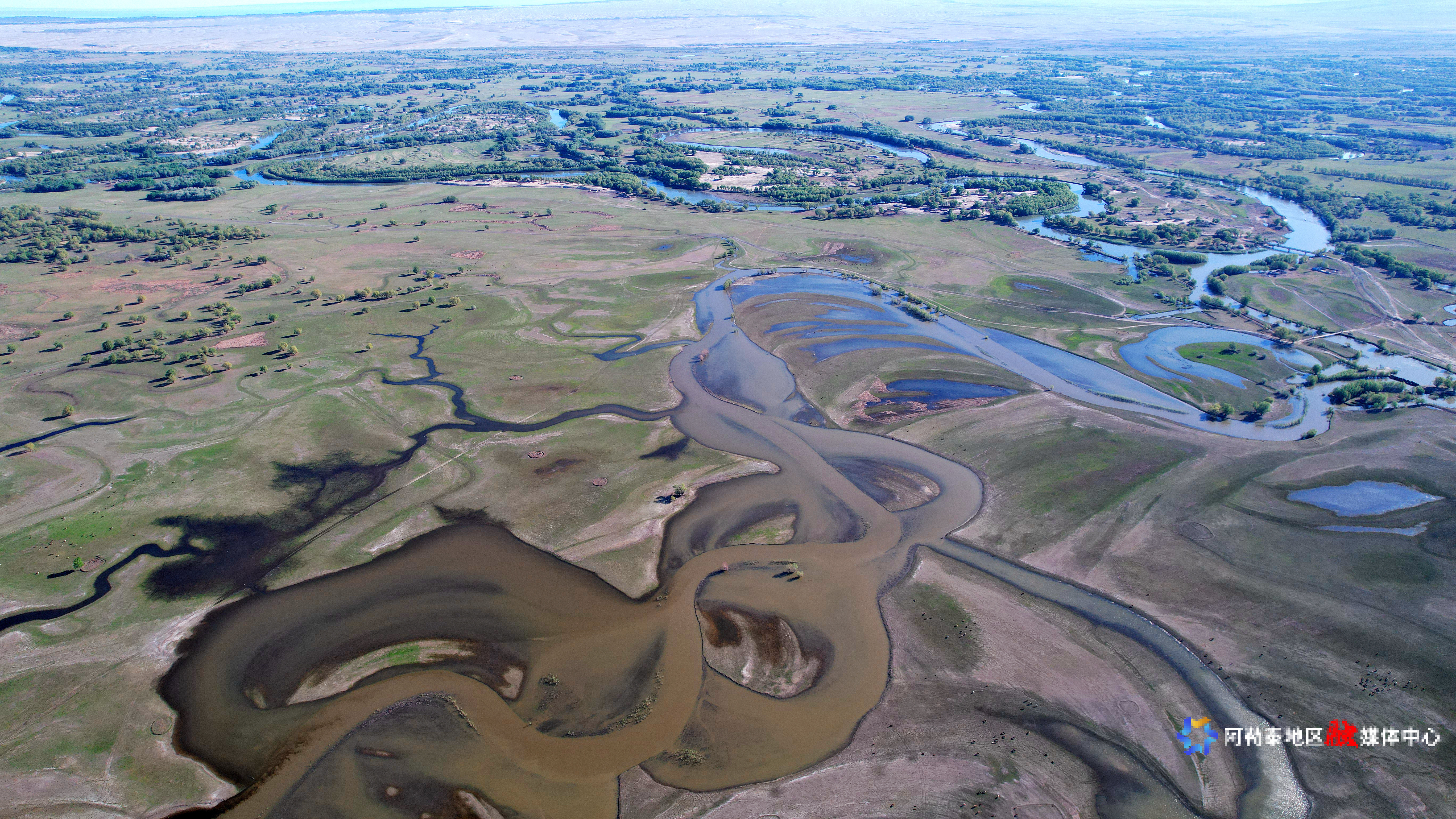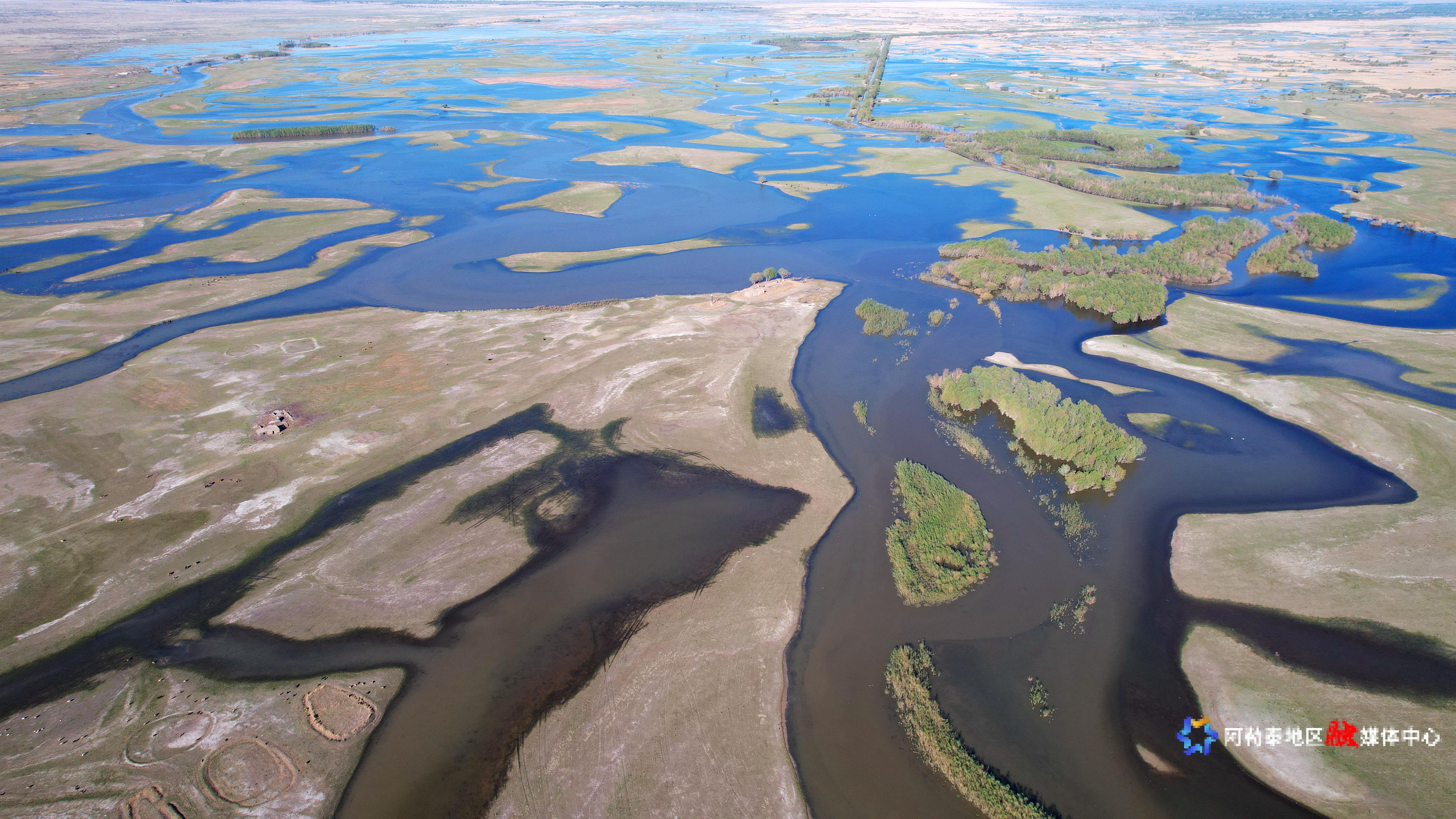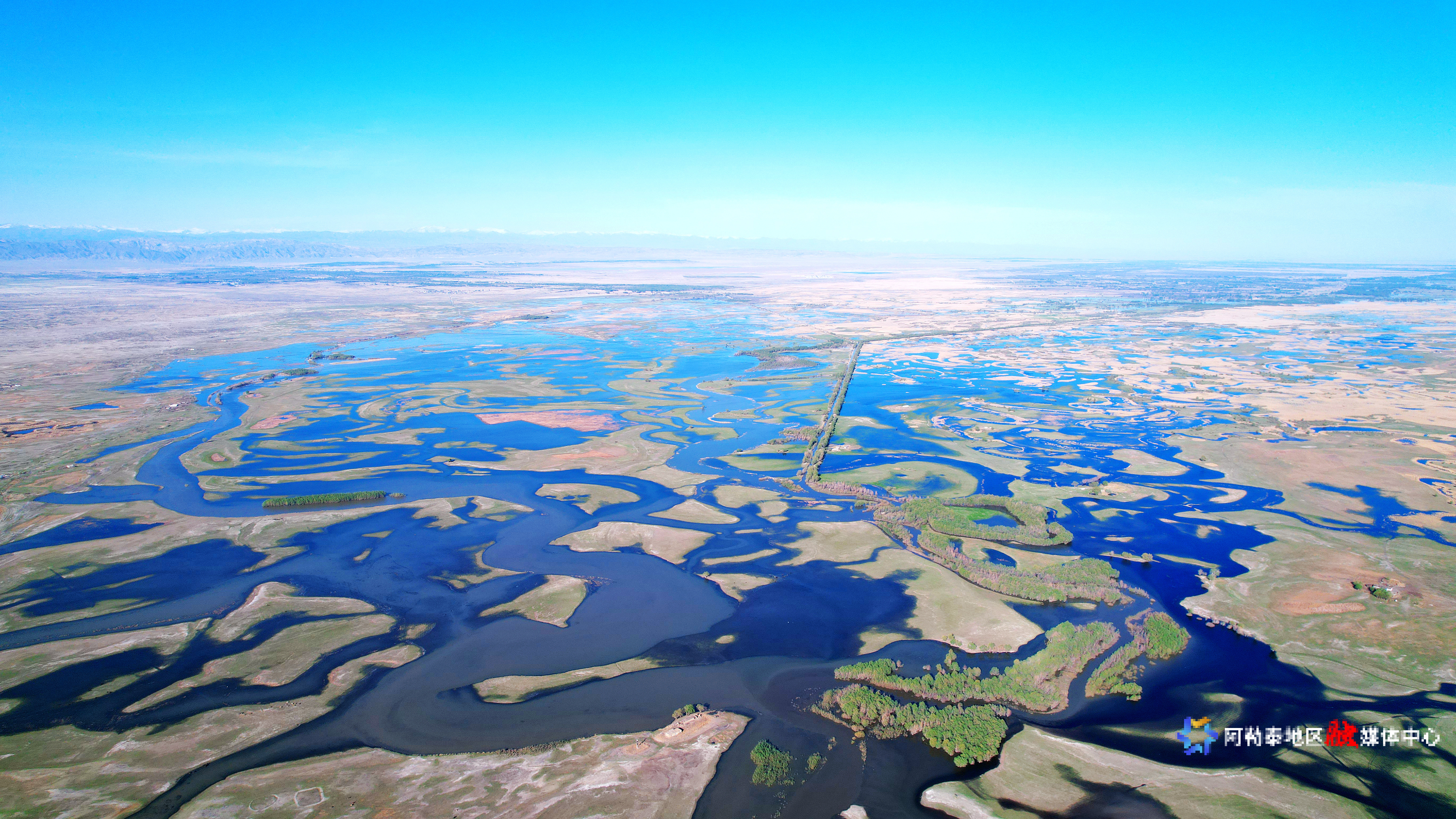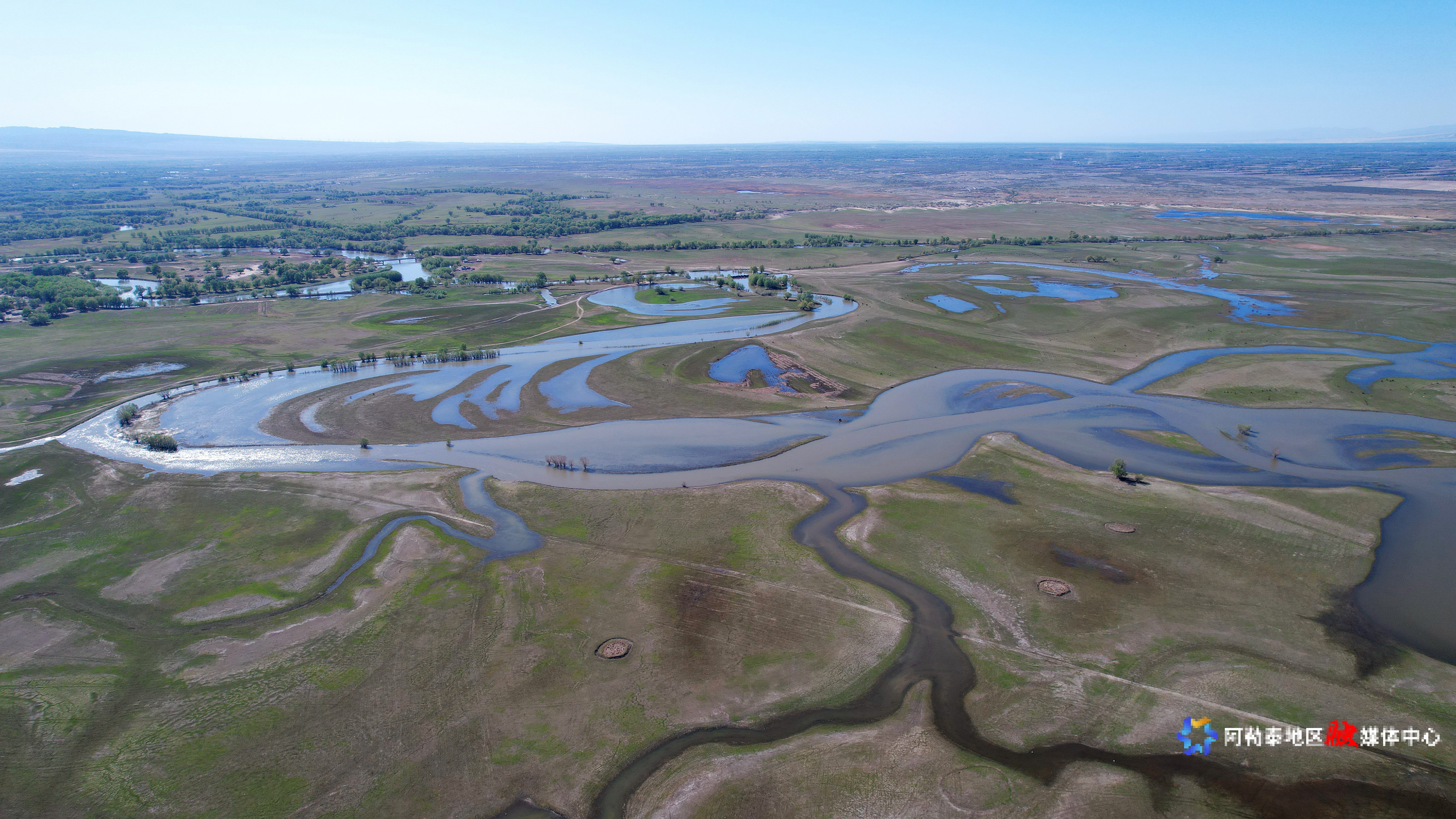 2025年5月8日,在阿勒泰科克苏湿地国家级自然保护区上空俯瞰,宛如一幅美丽和谐的生态画卷。记者 阿尔达克·拜斯汗 实习记者 塞力克·肯恩斯汗 摄