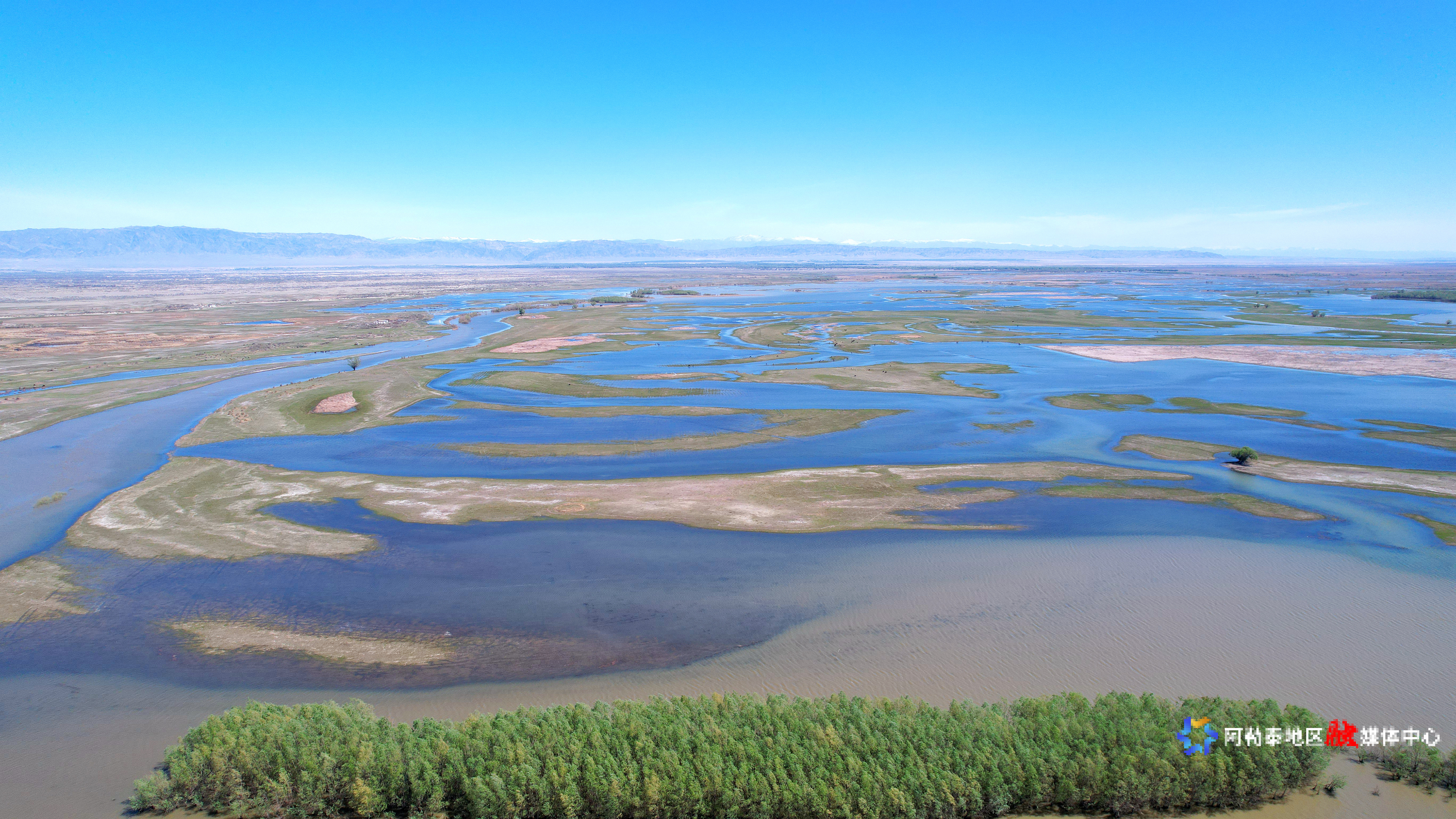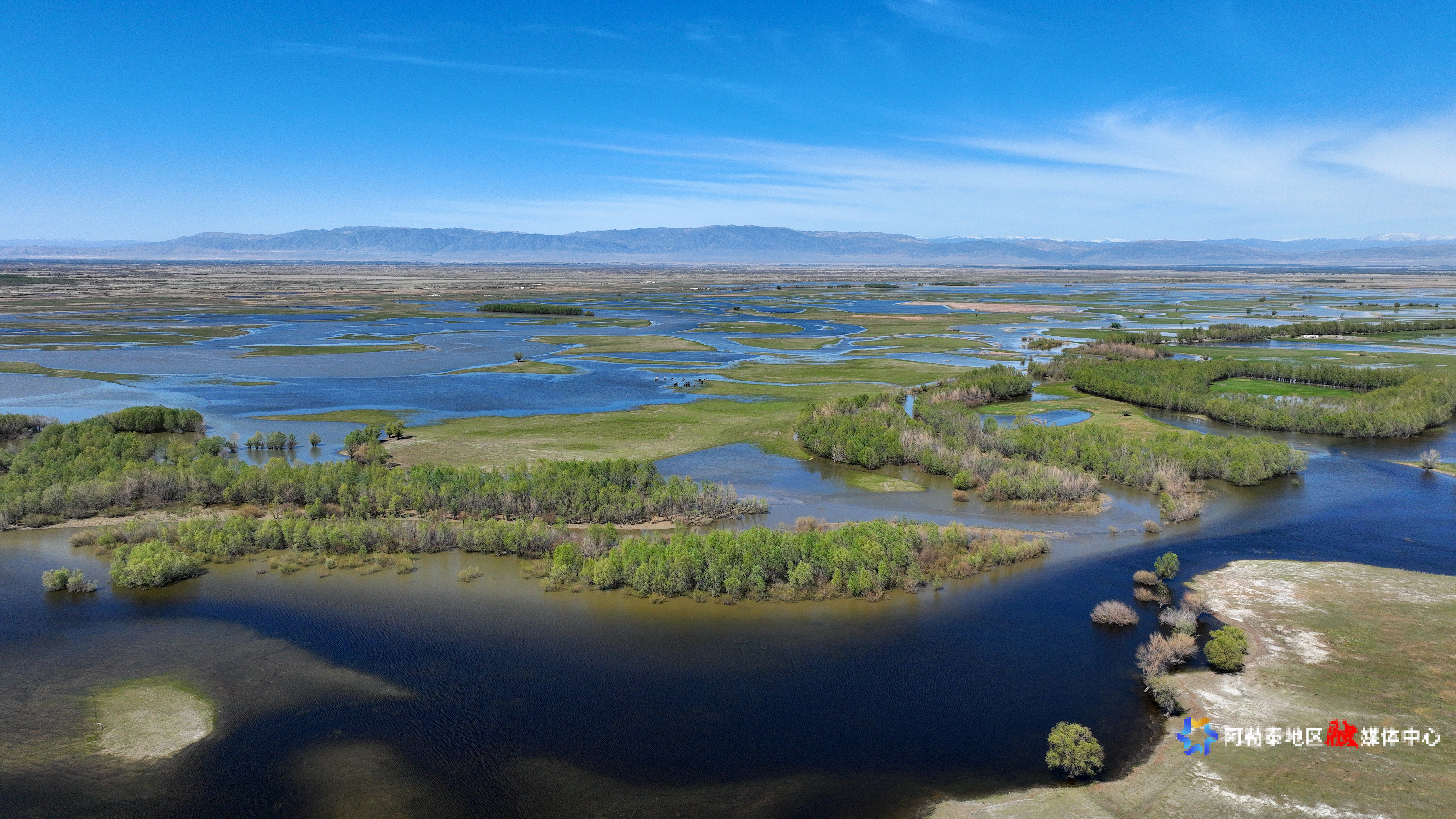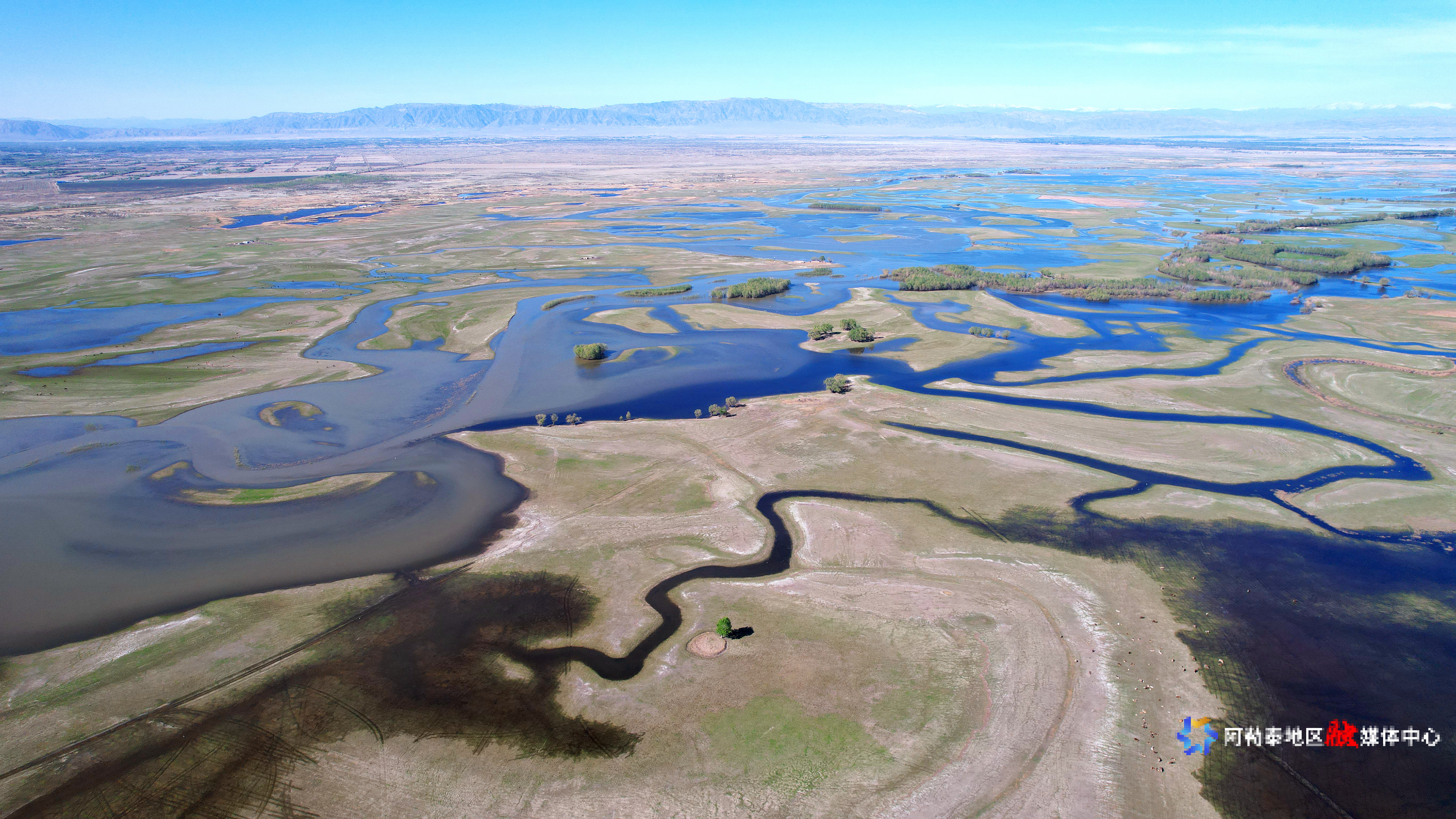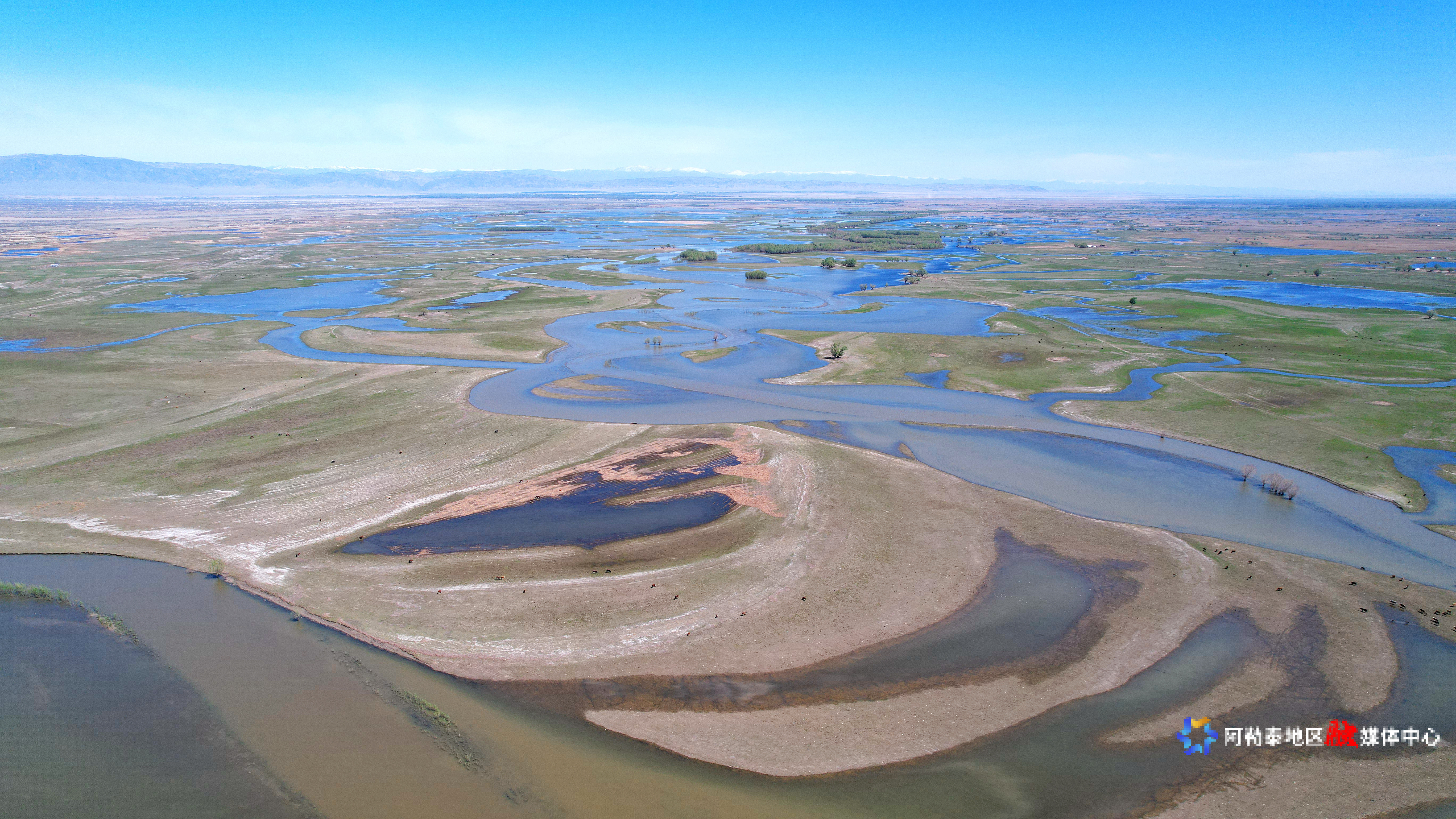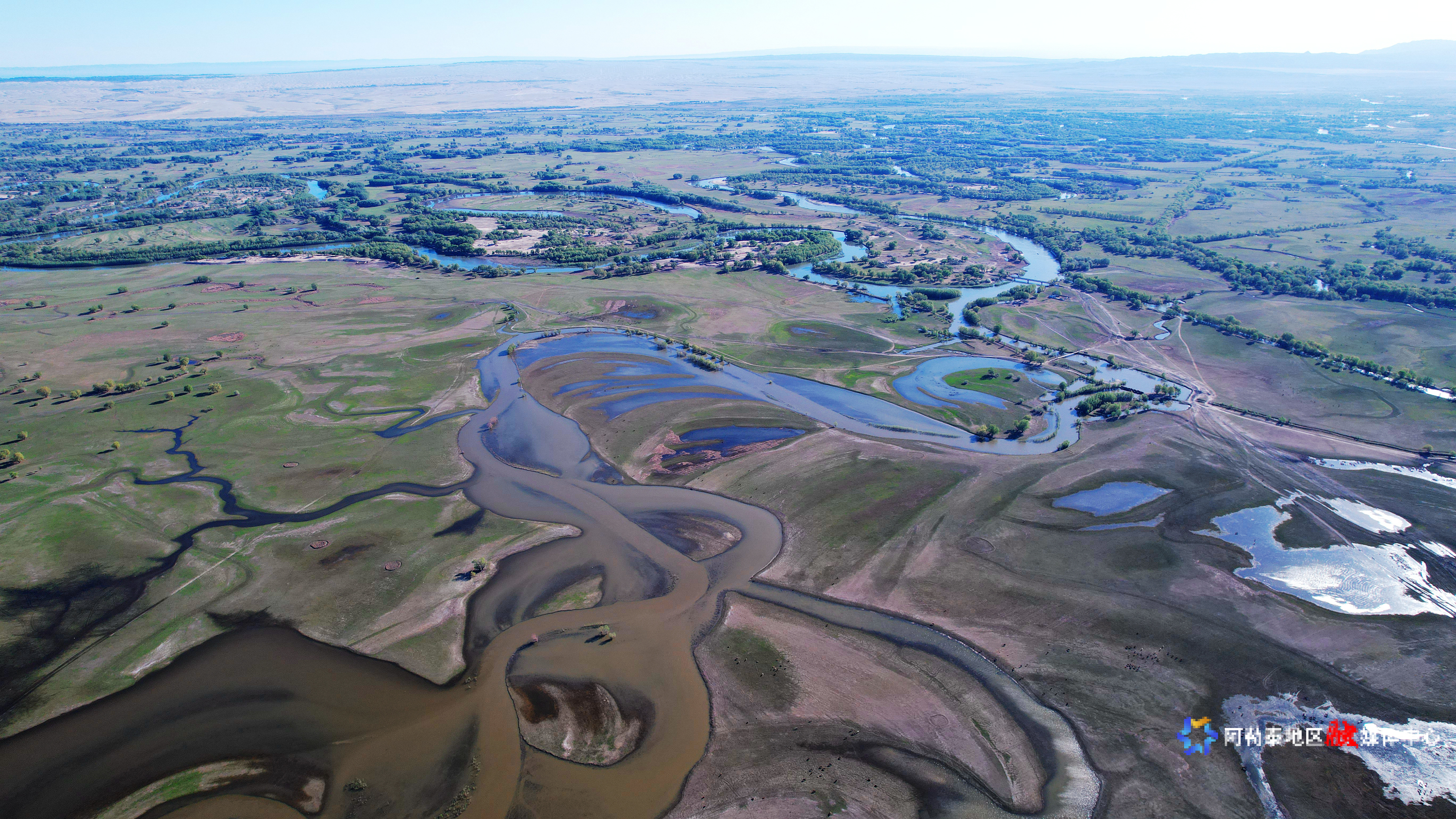 2025年5月8日,在阿勒泰科克苏湿地国家级自然保护区上空俯瞰,宛如一幅美丽和谐的生态画卷。记者 阿尔达克·拜斯汗 实习记者 塞力克·肯恩斯汗 摄