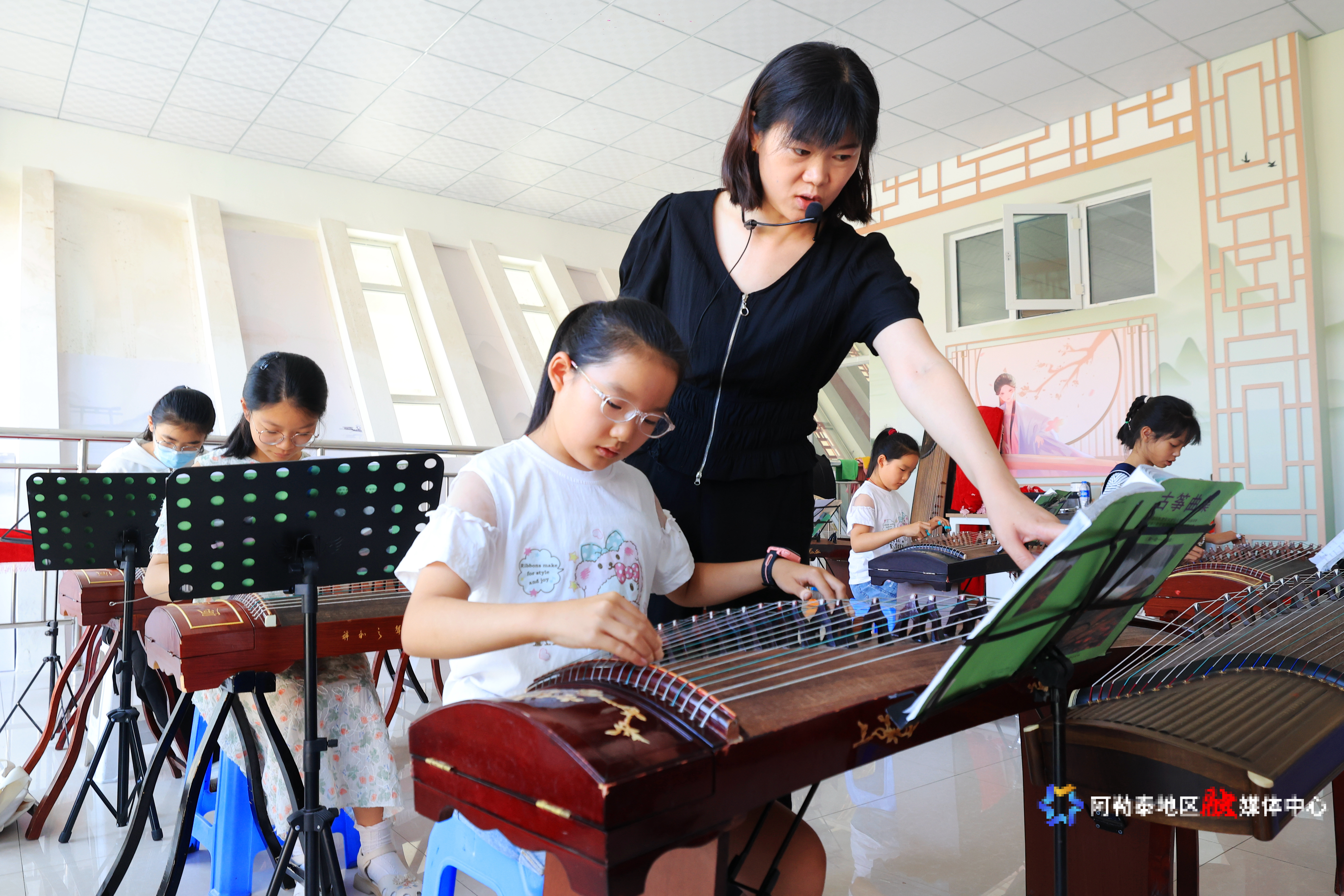 2025年7月11日,在阿勒泰市青少年活动中心,学生在老师的指导下,练习古筝。记者 阿尔达克·拜斯汗 摄