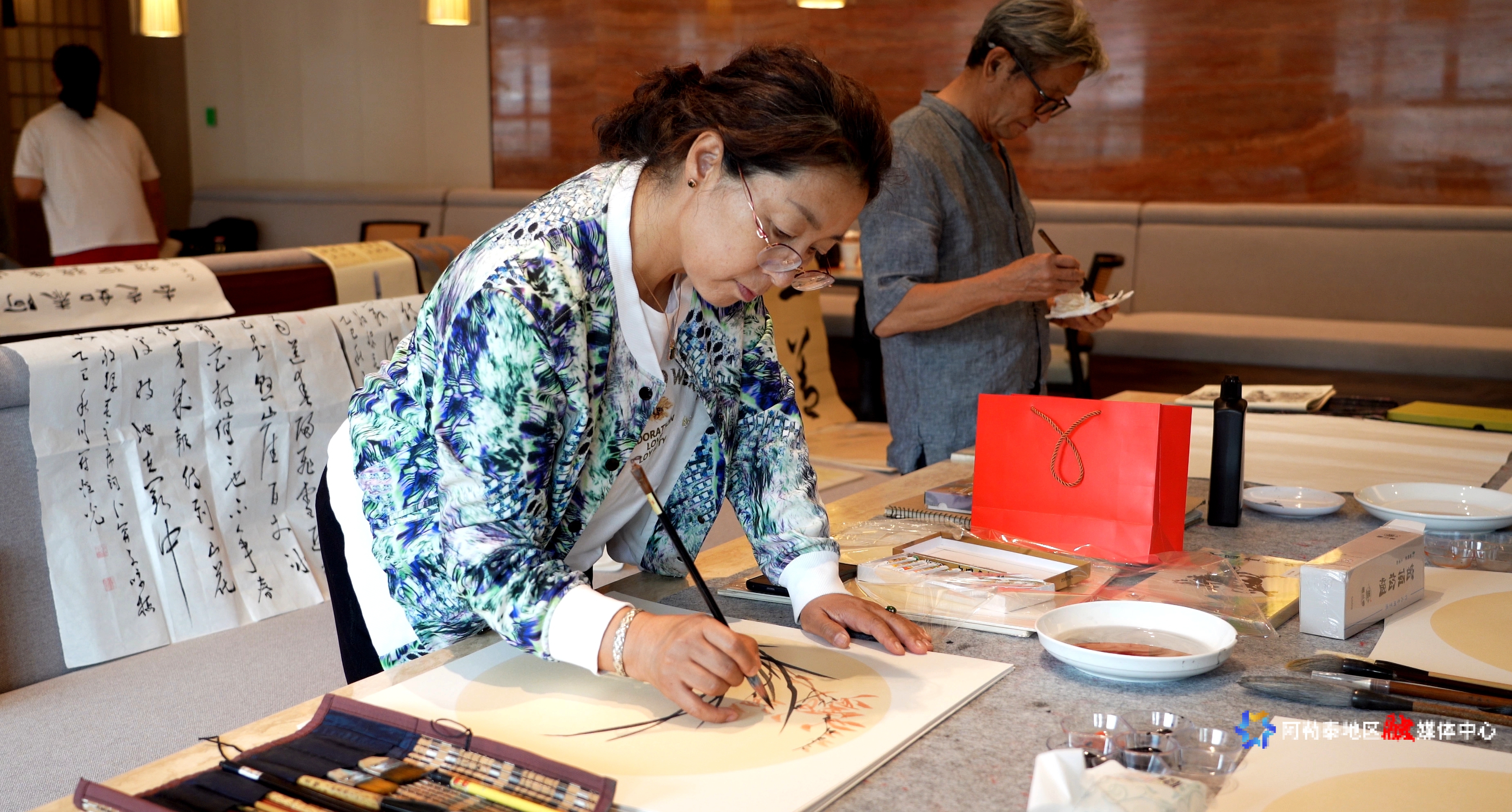 牢记艰苦卓绝的奋战,迈上昂扬奋进的征程。在这个特殊的日子里,地区书法家协会、阿勒泰市美术家协会与阿勒泰地区康正房地产开发有限公司逸扉酒店携手,举办“铭记与传承 墨韵共丹青”书画交流会,以艺术之笔铭记历史,为企业发展注入文化动能,搭建起艺术与企业深度交融的新平台。