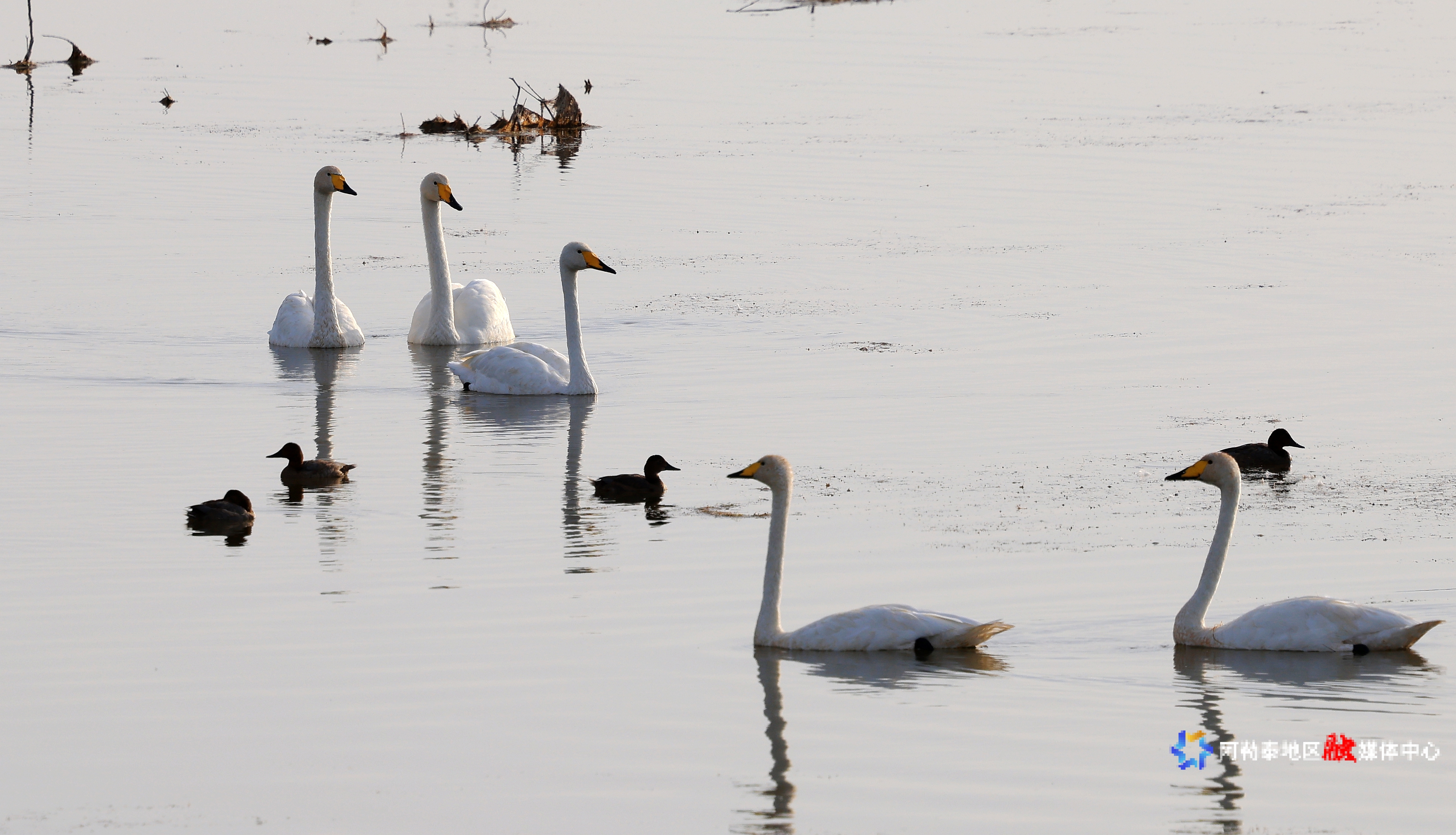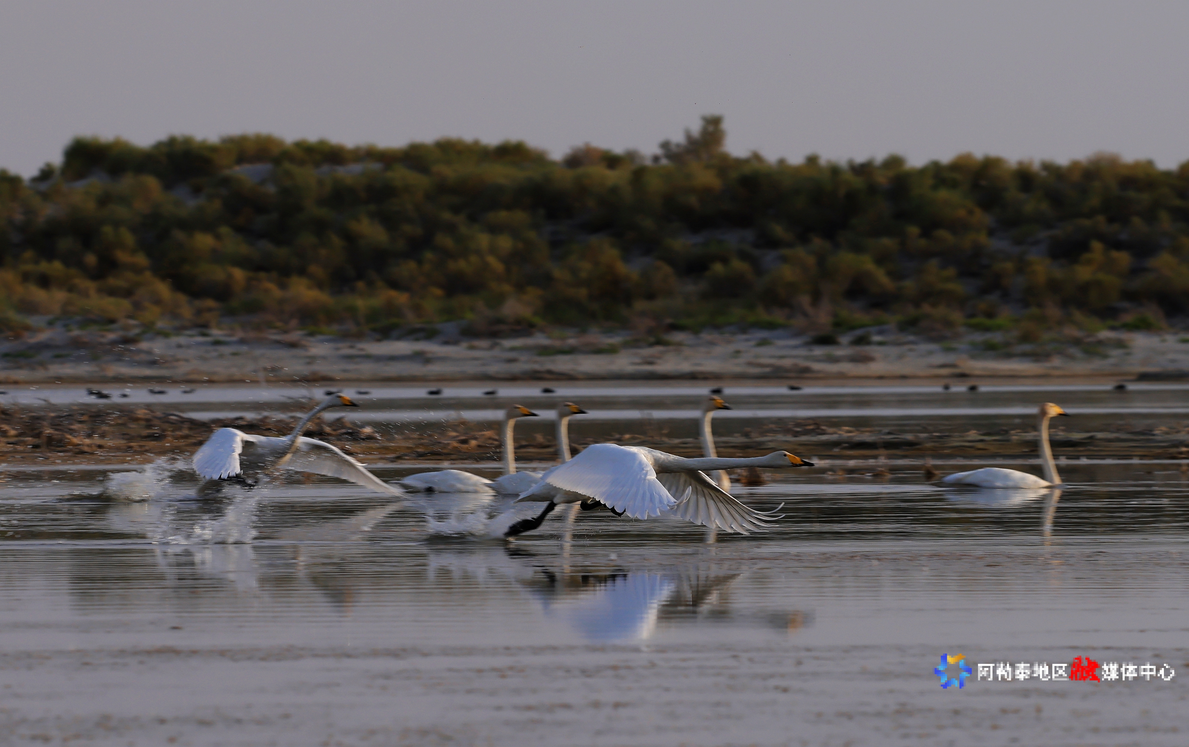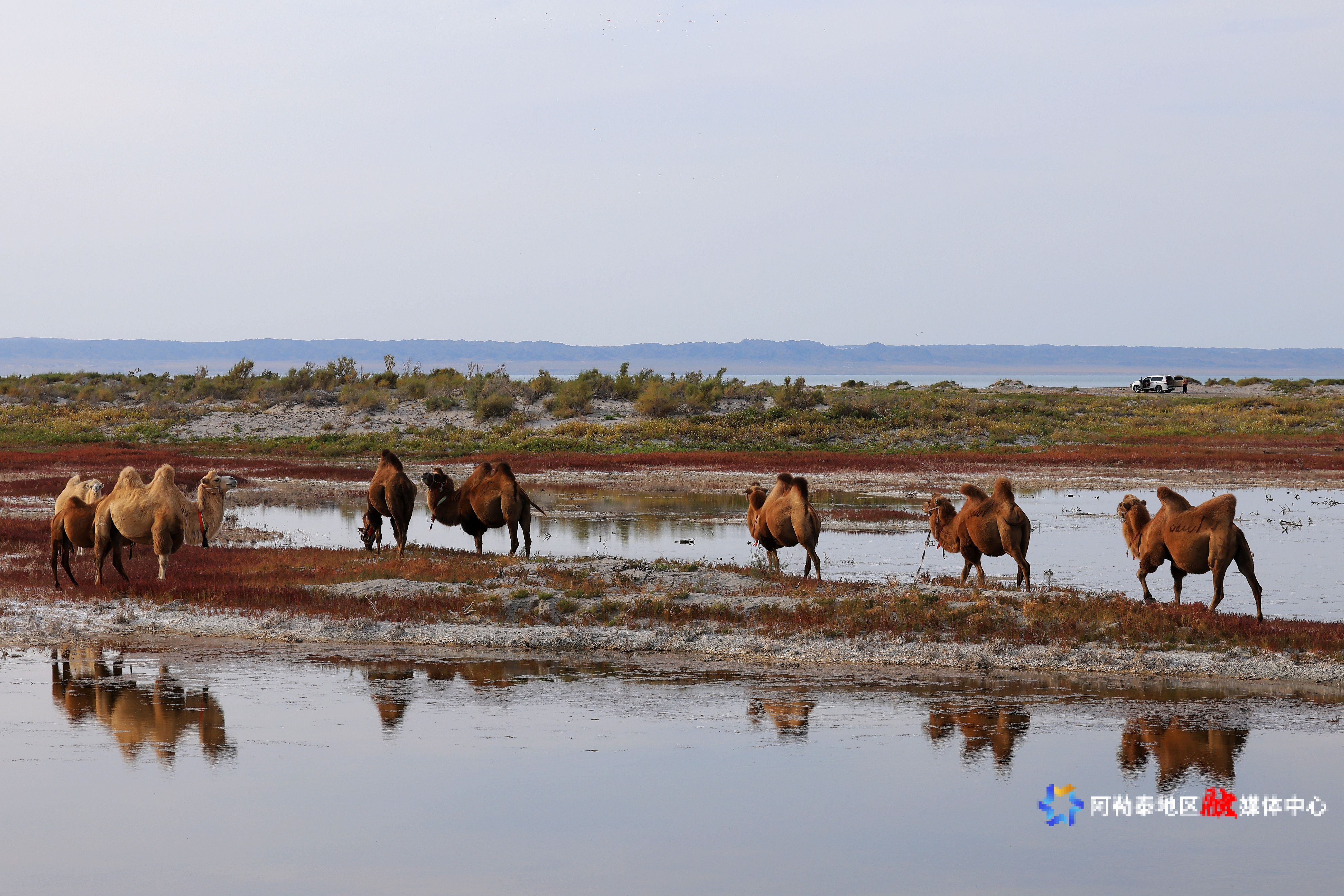 湖面上,成群的天鹅与鸬鹚悠然游弋,时而在水面觅食,时而展翅低飞,为宁静的湖面增添了几分生机。湖畔的沙滩上,骆驼悠闲踱步,与远方的雅丹地貌相映成趣,为游客们提供了多样化的观赏体验。