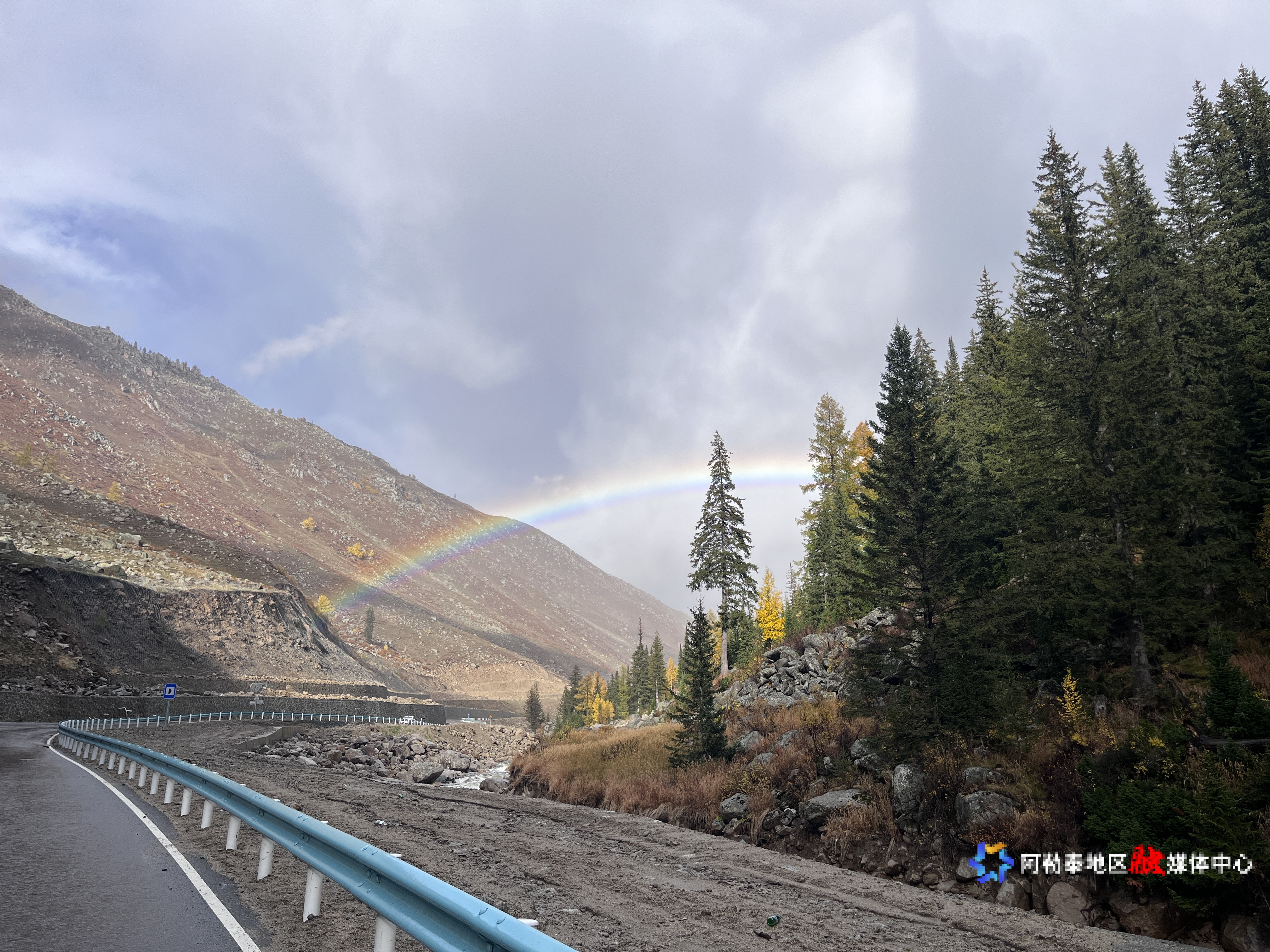 阿勒泰新闻网-阿勒泰地区融媒体中心(记者 漆月)9月20日,雨后的阿禾公路山间现巨幅彩虹,不少游客停车驻足,用镜头记录下这难得一见的美景。
