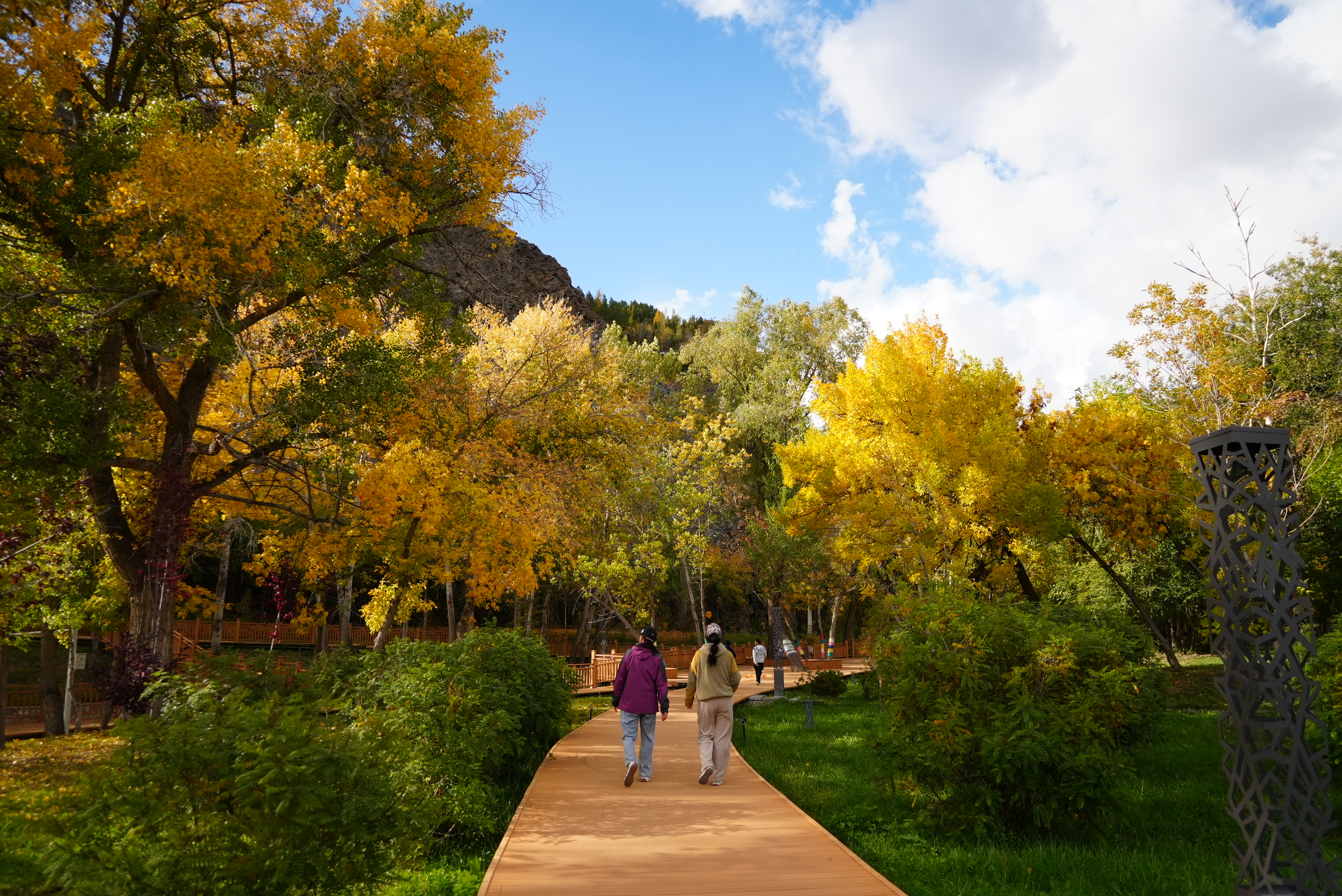 登临驼峰,可见松针墨绿、白桦金黄、野果嫣红,在秋阳下构成一幅流动的油画。山顶俯瞰,阿勒泰市区全景尽收眼底,秋色与城市风貌相映成趣。