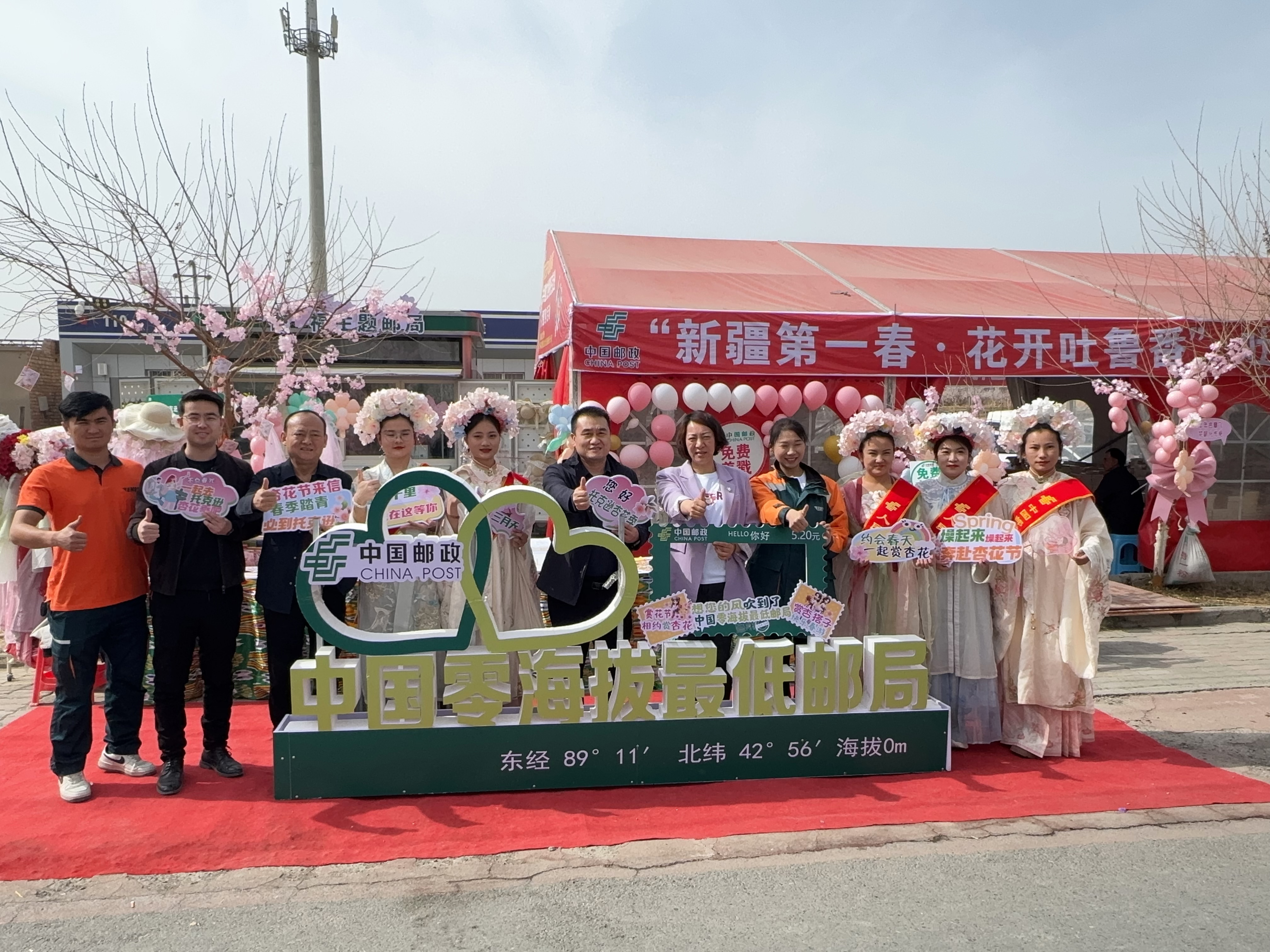 3月22日,“新疆第一春·花开吐鲁番”2025杏花节现场的“杏”福主题邮局前,游客和工作人员合影留念。吉宏燕摄