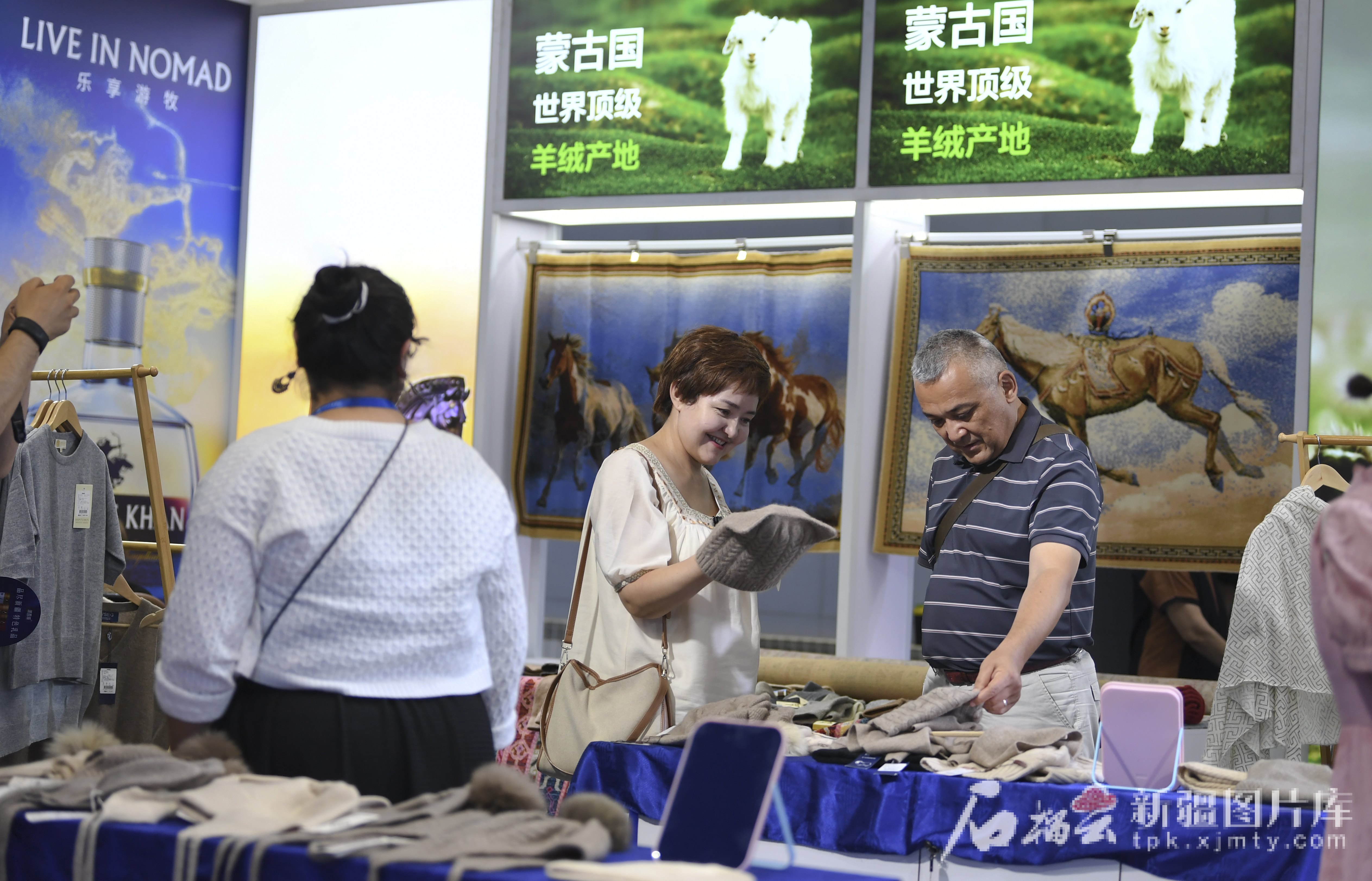 6月28日,参观者在蒙古国商品馆选购羊毛产品。