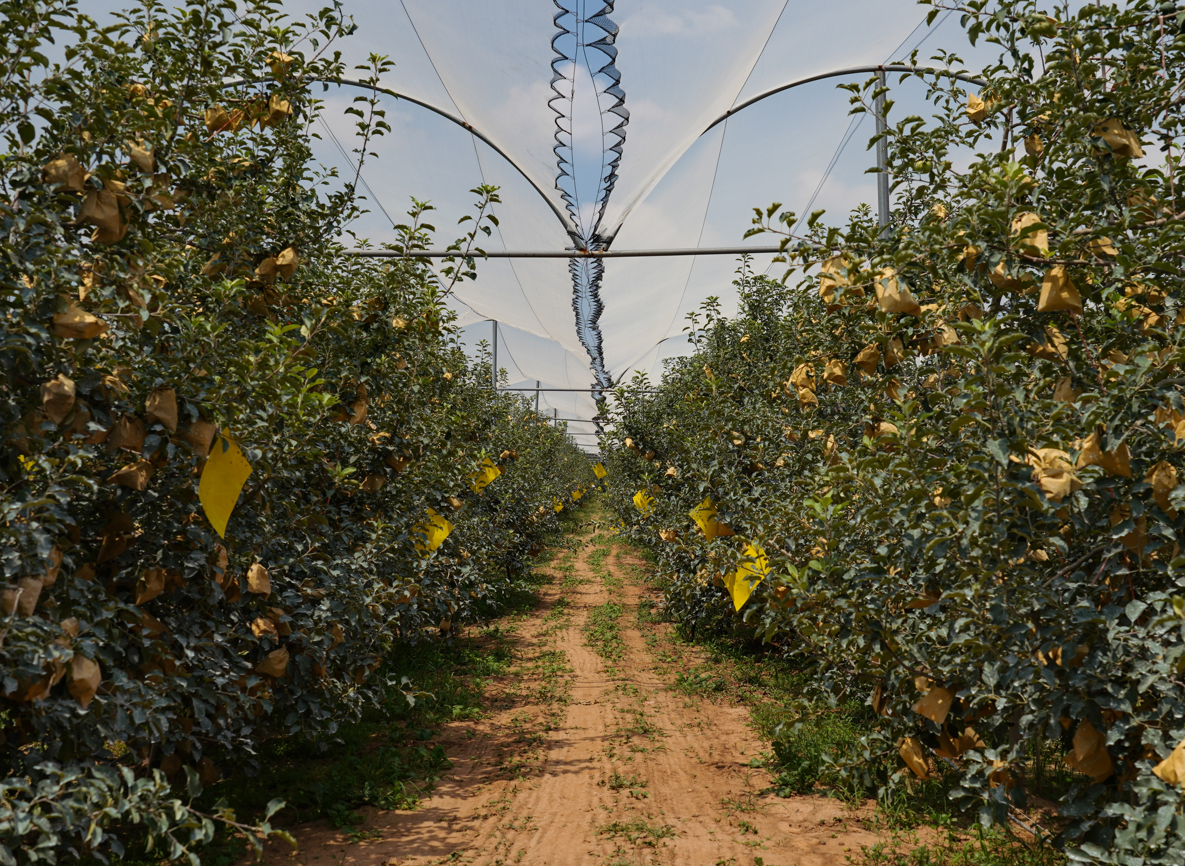 走进阿寺村的果园,浓浓的“技术范儿”扑面而来。在果农李亚民的矮化密植新式果园里,水肥一体化灌溉设施贯穿田间,防雹网在阳光下折射出细碎的银光。