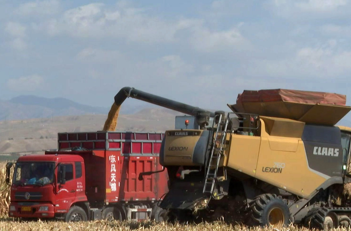 伊宁县阿乌利亚乡,收割机在收割玉米。图/伊犁融媒体中心提供