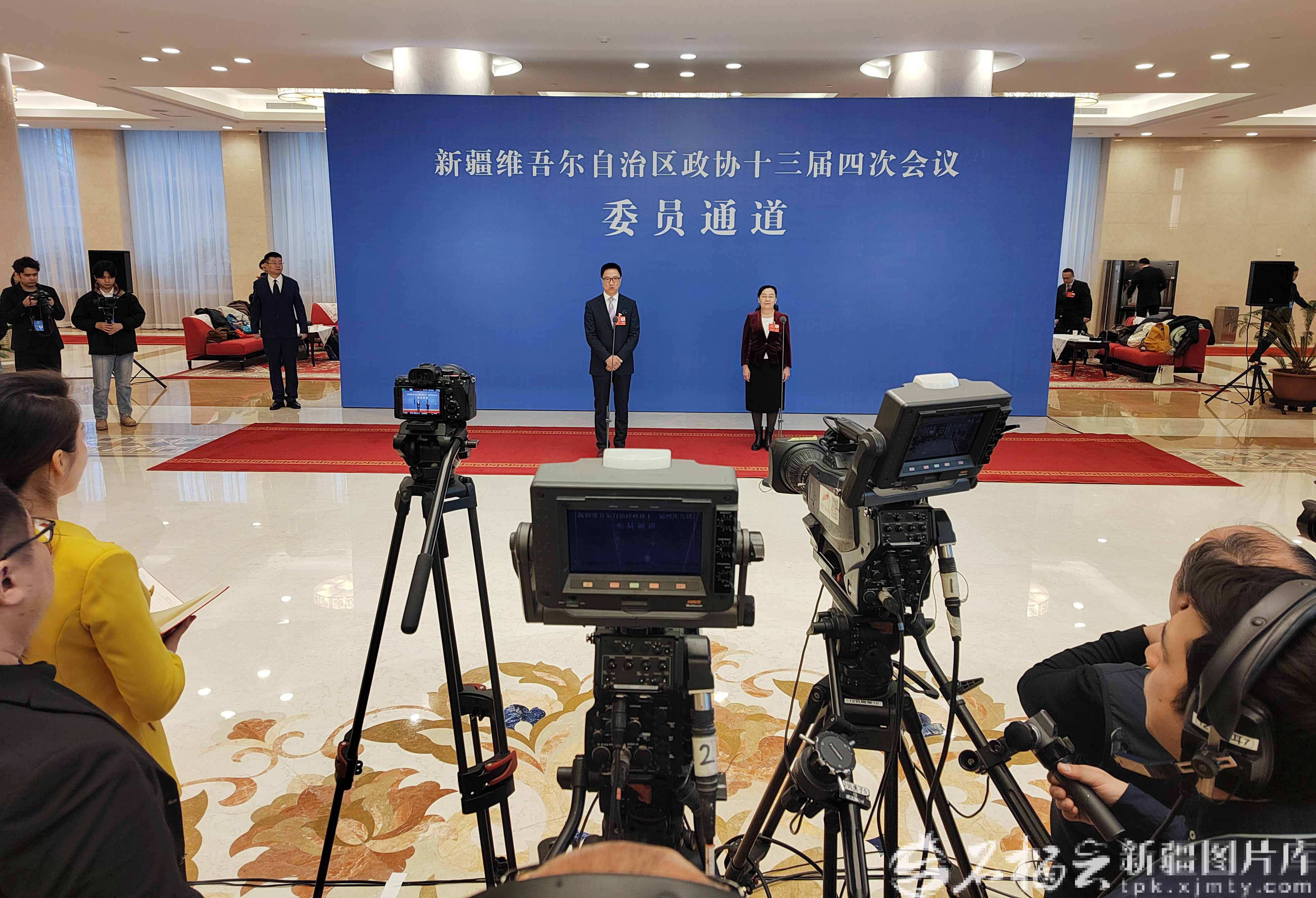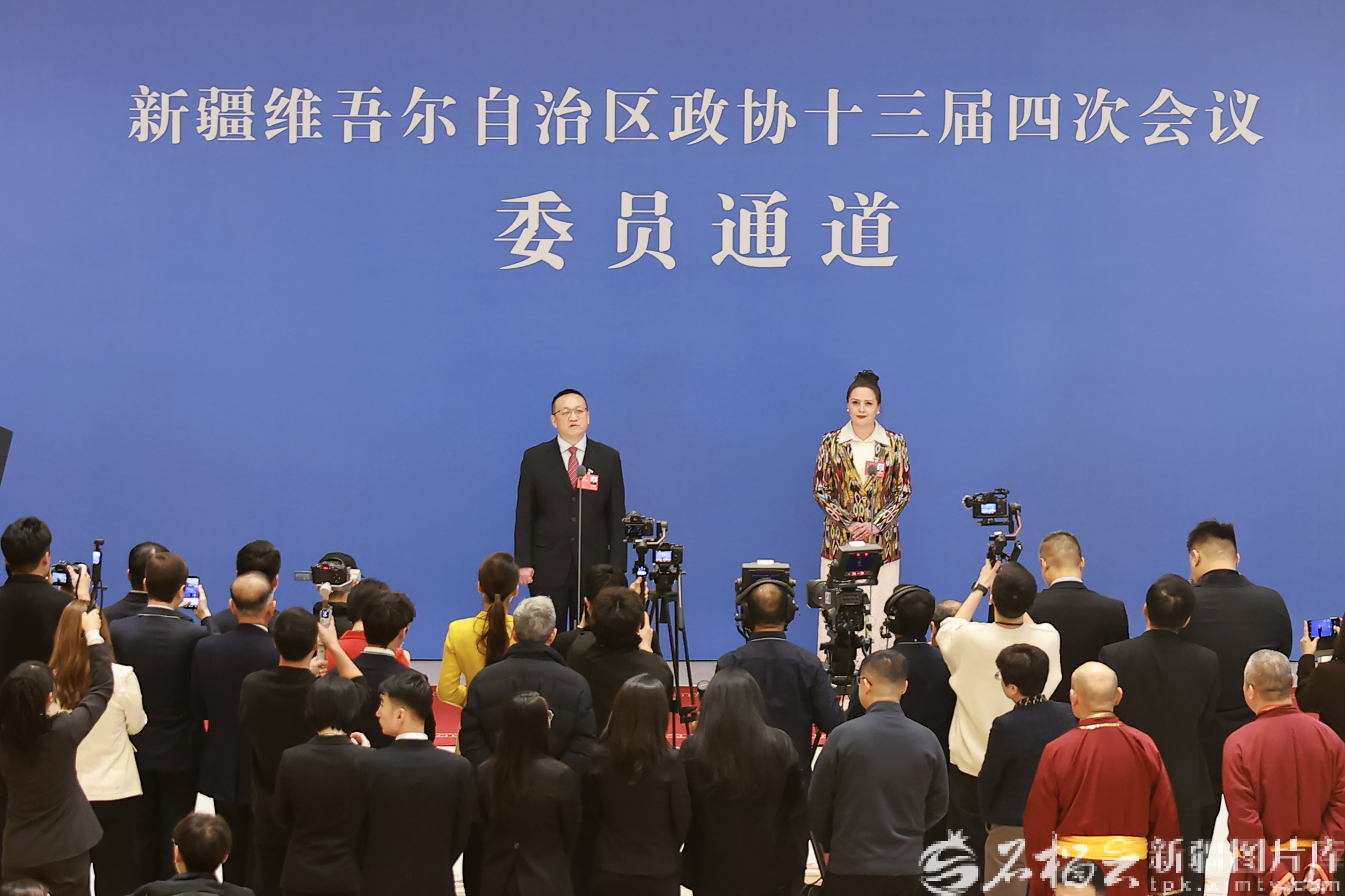 1月26日,自治区政协十三届四次会议“委员通道”集体采访活动现场,刘文、孔都孜扎衣塔亚两位委员接受采访。石榴云/新疆日报记者 崔志坚摄